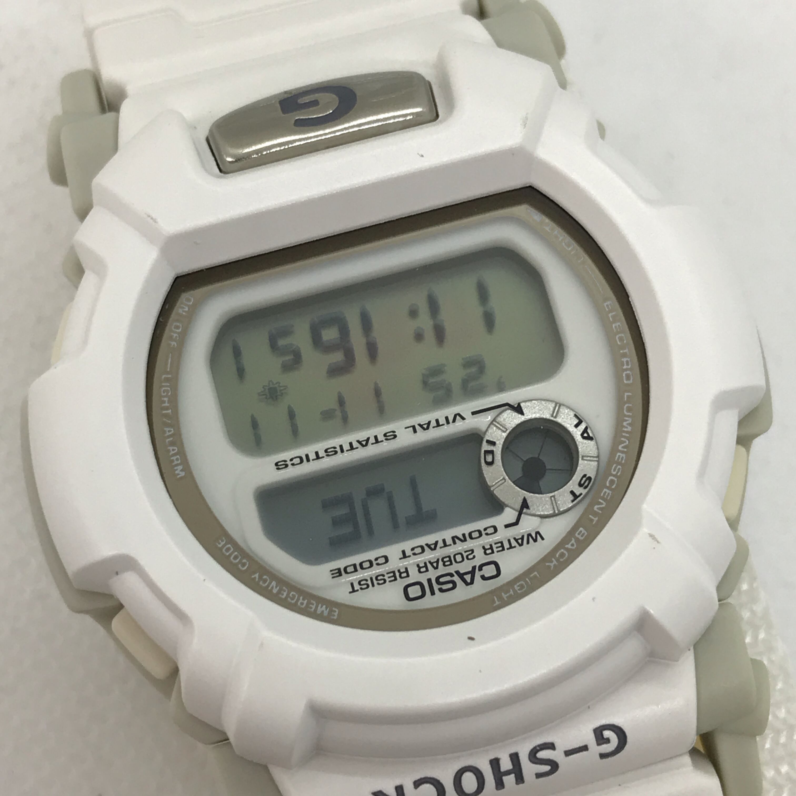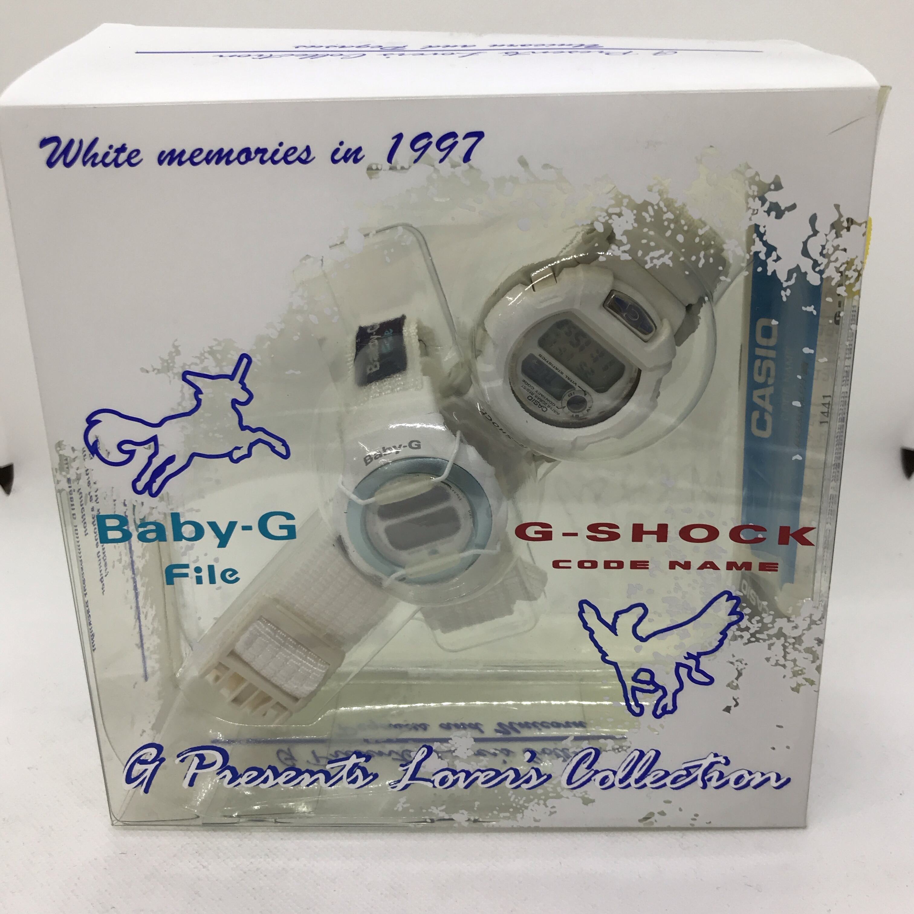 カシオ CASIO G-SHOCK LOV97-5(1997年11月発売)は、恋人たちに贈るクリスマス限定ペアウォッチ「ラバーズコレクション」の1つで、**「魔女とドラゴン」**をテーマにしたモデルです。G-SHOCKとBaby-Gの2本セットで販売され、純白のペアデザインが特徴です。