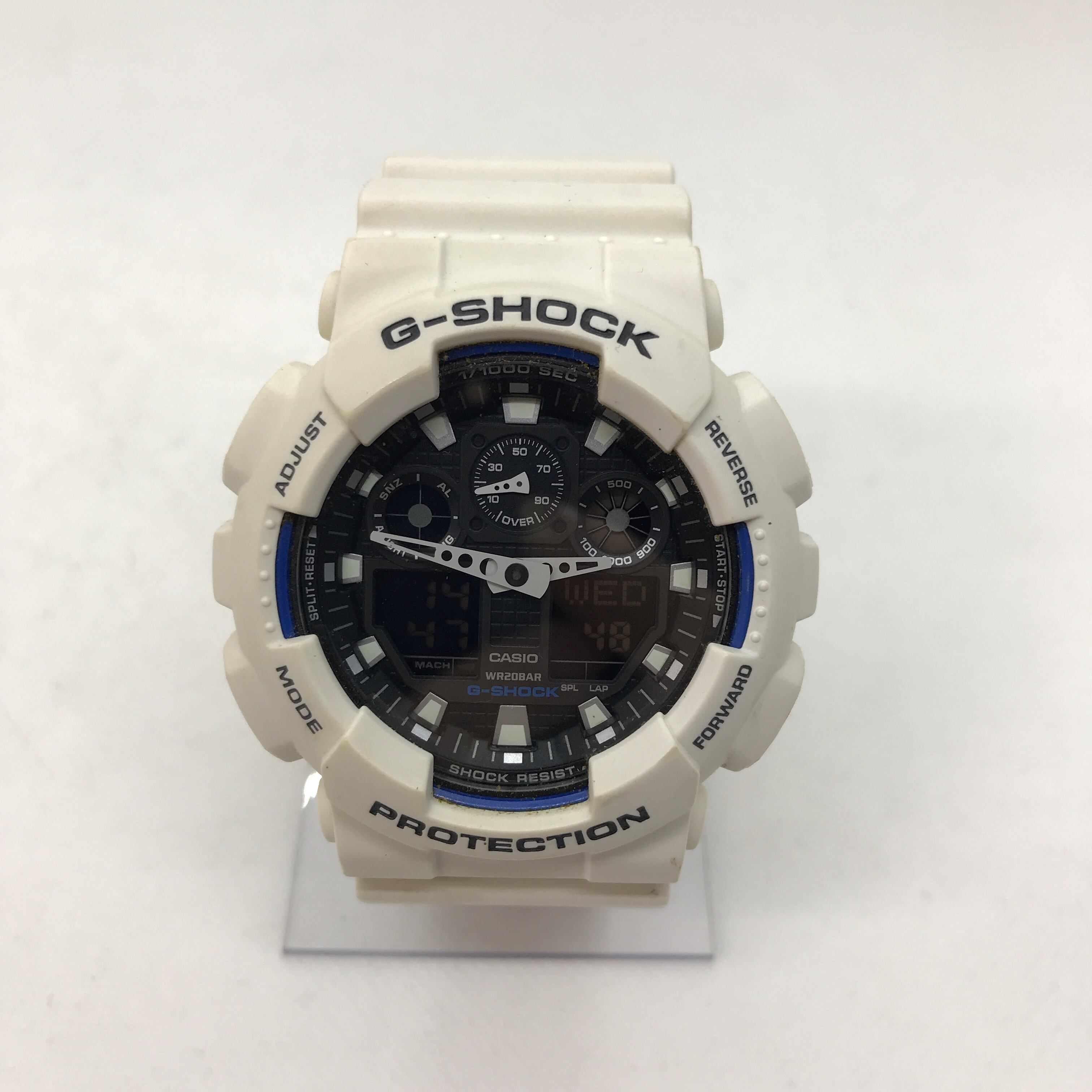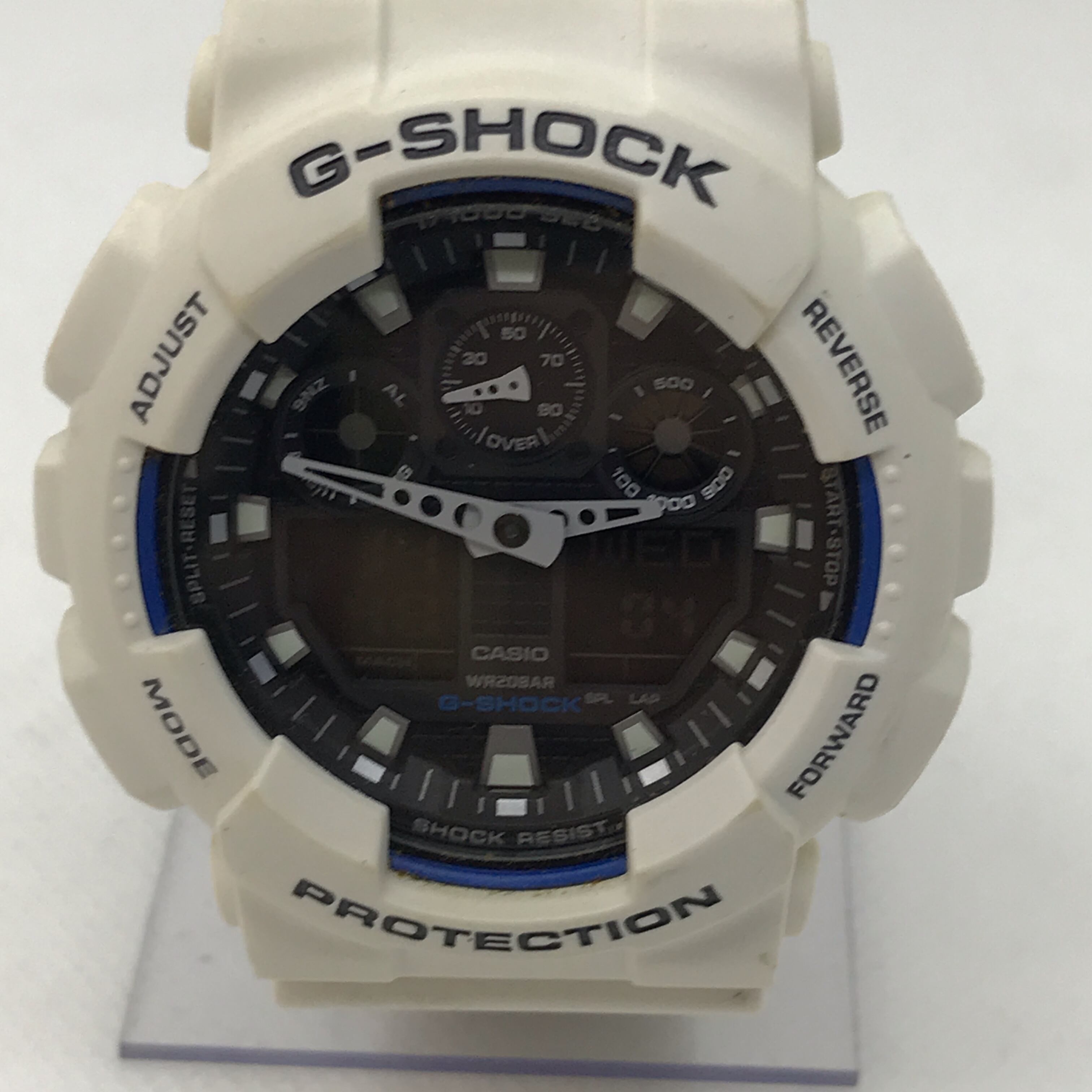 デザイン: ワイドフェイスが好評のGA-100シリーズのカラーバリエーションで、マット仕上げのケースとバンドにシンプルなホワイト×ブラックのカラーを採用しています。文字板には4つの液晶窓とスピードインジケーターがシンメトリーに配置され、すっきりとしたフェイスデザインに仕上げられています。